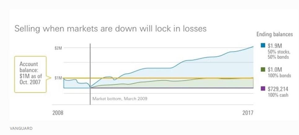 Vanguard conducted a study to find 10-year returns of investors who adopted different strategies during the last recession of 2007 – 2009. One investor chose to sell all holdings and put their cash into savings accounts. The second investor opted for bonds while the third investor continued to hold the 50-50 stock-bond portfolio.